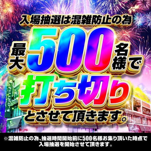 混雑防止の為、500名様お集まり頂いた時点で入場抽選を開始させていただきます。