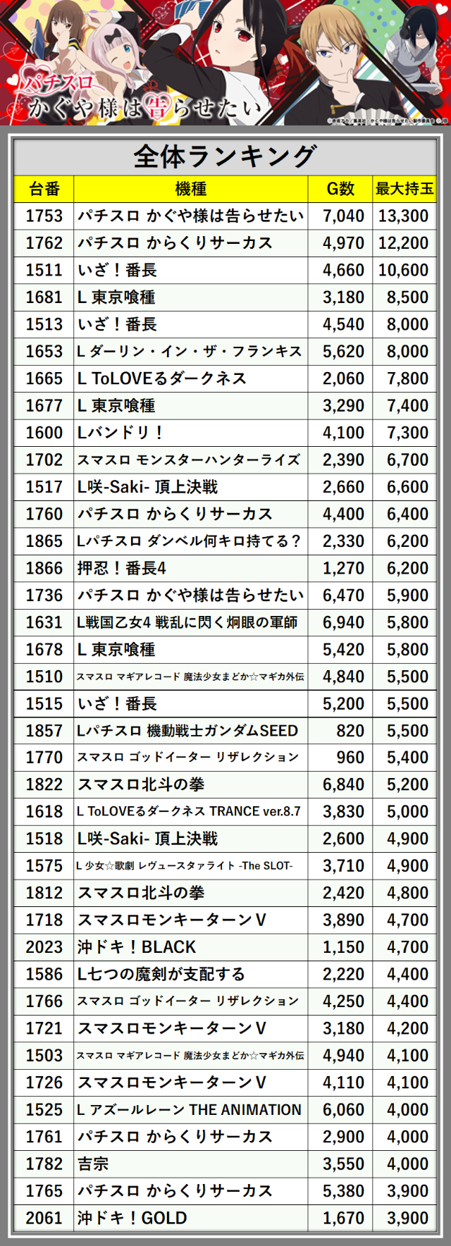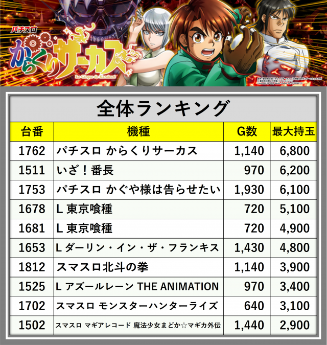 厳選された取材対象機種をはじめ、その他スロット全体から好記録が飛び出した!プレイヤーが楽しんだ1日を下記データにて振り返ってみて欲しい。