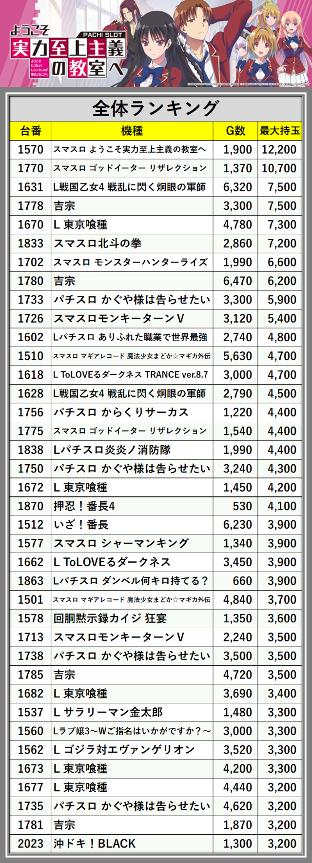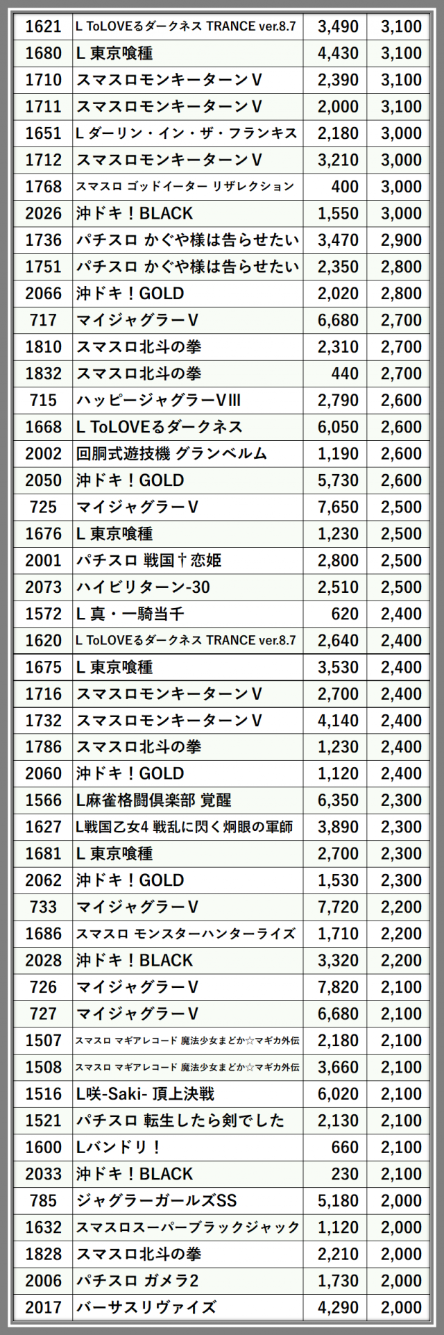 厳選された取材対象機種をはじめ、その他スロット全体から好記録が飛び出した!プレイヤーが楽しんだ1日を下記データにて振り返ってみて欲しい。