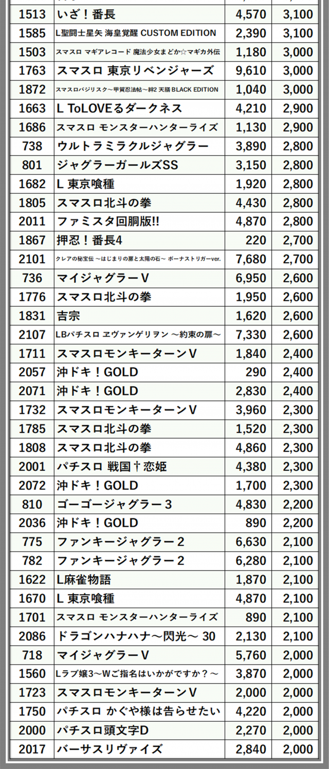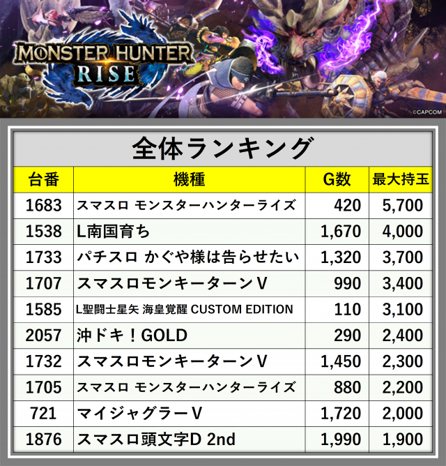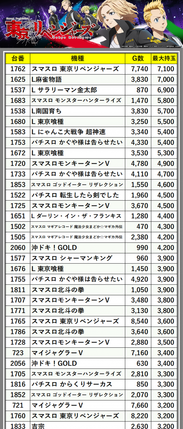 厳選された取材対象機種をはじめ、その他スロット全体から好記録が飛び出した!プレイヤーが楽しんだ1日を下記データにて振り返ってみて欲しい。