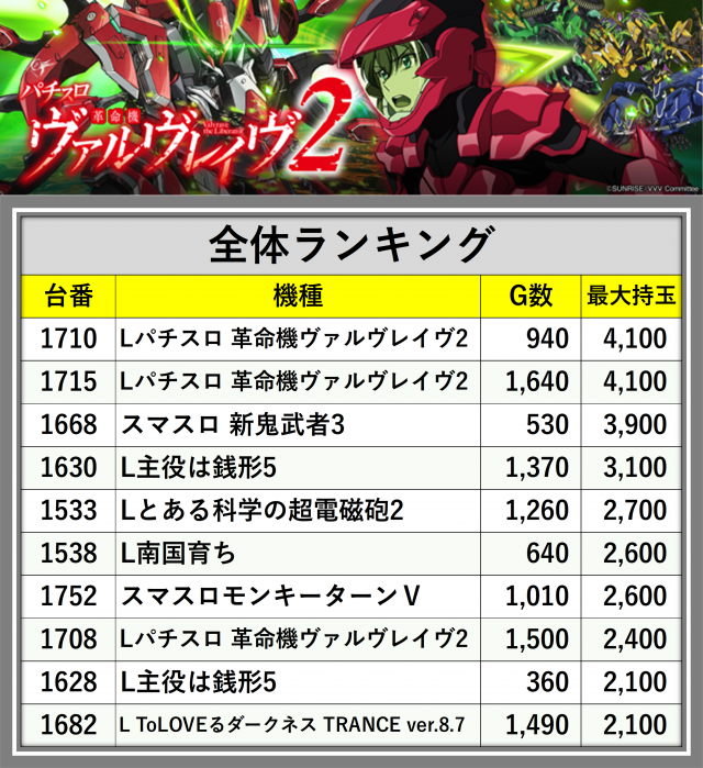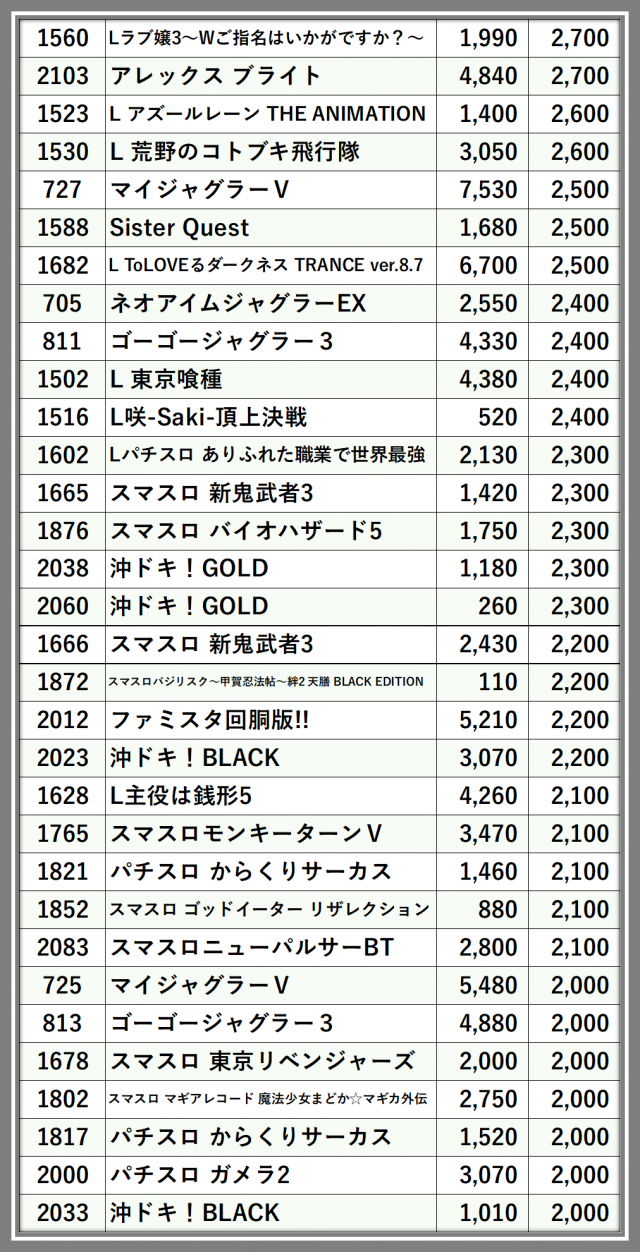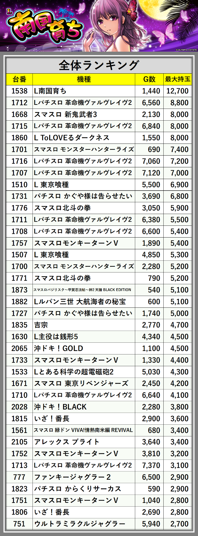 厳選された取材対象機種をはじめ、その他スロット全体から好記録が飛び出した!プレイヤーが楽しんだ1日を下記データにて振り返ってみて欲しい。