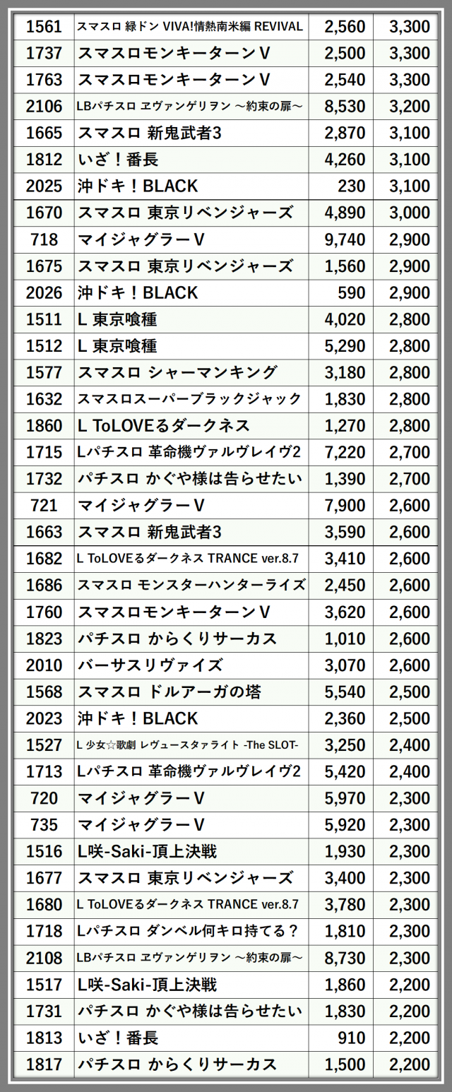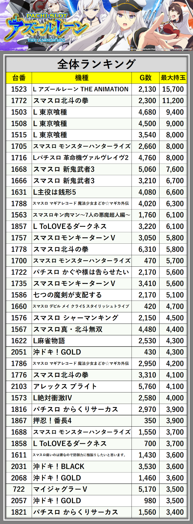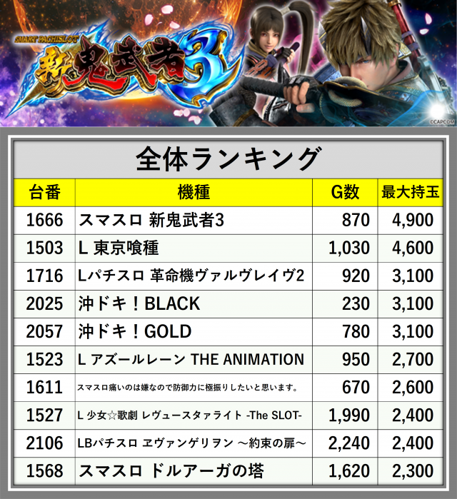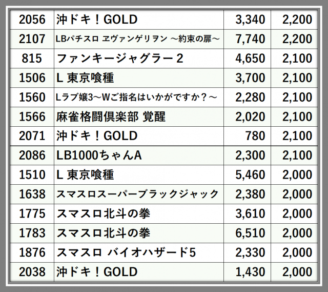 厳選された取材対象機種をはじめ、その他スロット全体から好記録が飛び出した!プレイヤーが楽しんだ1日を下記データにて振り返ってみて欲しい。