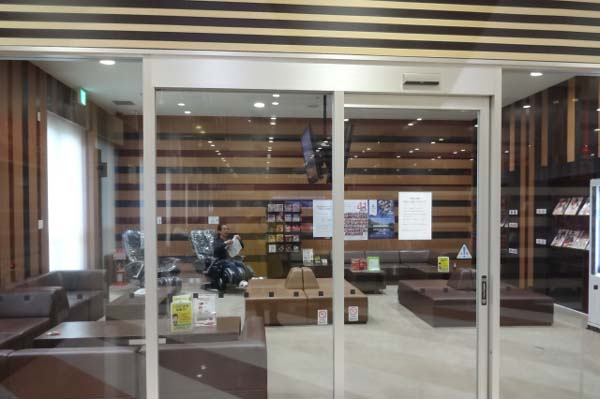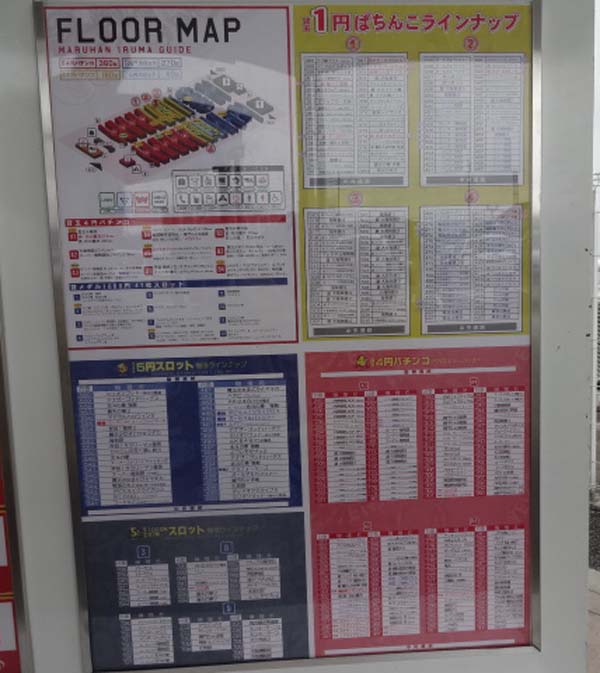 休憩所も広く清潔感があり、雑誌なども豊富でプレイヤーのリフレシュ空間となっている。店外入口の壁に台の場所とラインナップのポスターがあり、店内のコーナー入り口に、人気機種のポスターや遊パチとプレイヤーが真っ先に目に付く場所に、大々的にアピールし分かり易かった。