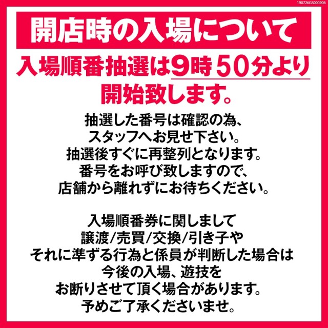 パチンコ・・・並び順 スロット・・・ 9:50までに並ばれたお客様を対象に抽選 |
