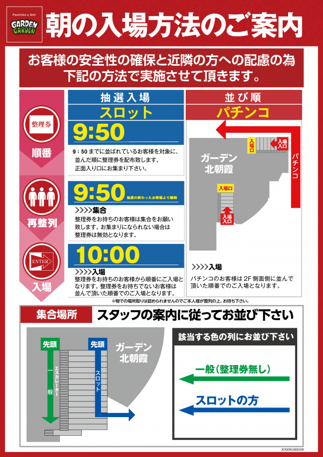 パチンコ・・・並び順 スロット・・・ 9:50までに並ばれたお客様を対象に抽選 |
