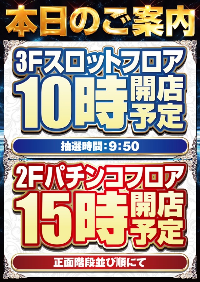 パチンコ・・・並び順 スロット・・・ 9:50までに並ばれたお客様を対象に抽選 |