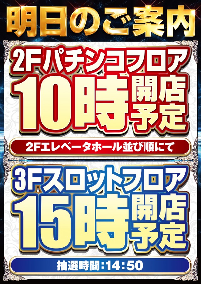 パチンコ・・・並び順 スロット・・・ 9:50までに並ばれたお客様を対象に抽選 |