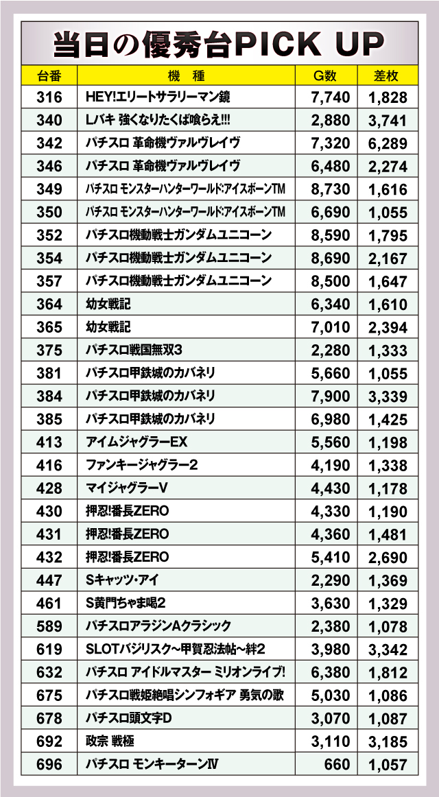 まずは優秀30台のPICK UPから。30台のうちもっとも差枚数が高かったのは、342番台の「パチスロ 革命機ヴァルヴレイヴ」で、+6,289枚。次いで「Lバキ 強くなりたくば喰らえ!!!」「SLOTバジリスク~甲賀忍法帖~絆2」など+3,000枚オーバーの台を複数確認することができた。総じて6.5号機やスマスロのハイスペック機種の活躍が目立っていた。