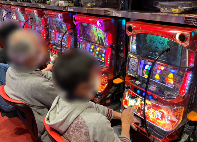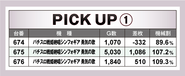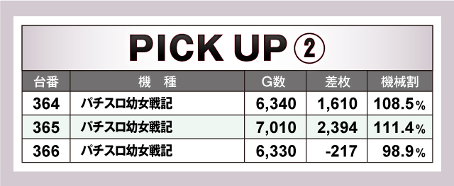 続いては当日3台並びで盛り上がりを見せた3箇所を紹介していこう。今回「パチスロ戦姫絶唱シンフォギア 勇気の歌」「パチスロ幼女戦記」「パチスロ甲鉄城のカバネリ」の3機種3台並びをピックアップしたが、とくに「パチスロ甲鉄城のカバネリ」の活躍が素晴らしく、3台全台がプラスで平均+1,642枚と優秀な成績をマーク。他2箇所も4ケタプラスの台が出現していたので、期待値が高い並びだったことは間違いなさそうだ!
