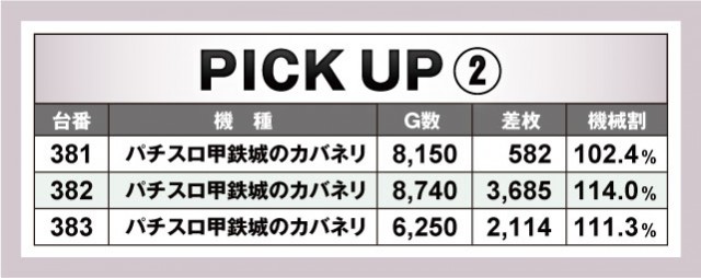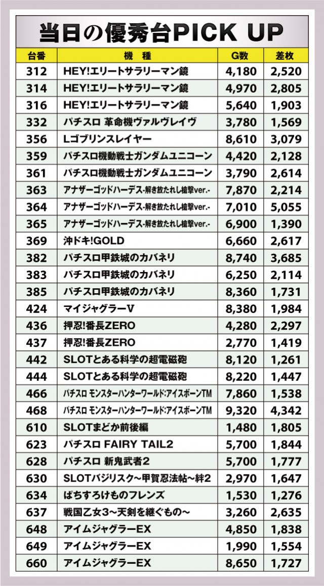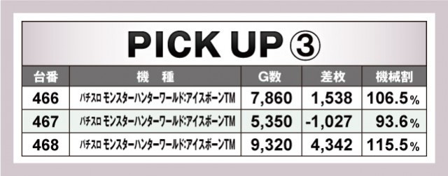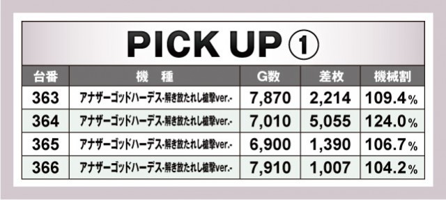 まずは今回の優秀台をご覧いただこう。『埼玉県某店』もだいぶスマスロが浸透してきており、新旧含めて50台以上が設置されているわけだが、今回はスマスロというよりかは6.5号機のAT機のほうが総じて好調。『アナザーゴッドハーデス-解き放たれし槍撃ver.-』や『パチスロ モンスターハンターワールド:アイスボーンTM』、『パチスロ甲鉄城のカバネリ』などが挙げられるか。ピックアップもこの3機種となっているのでさらに詳しいデータは以下をチェック!