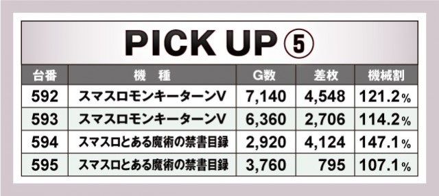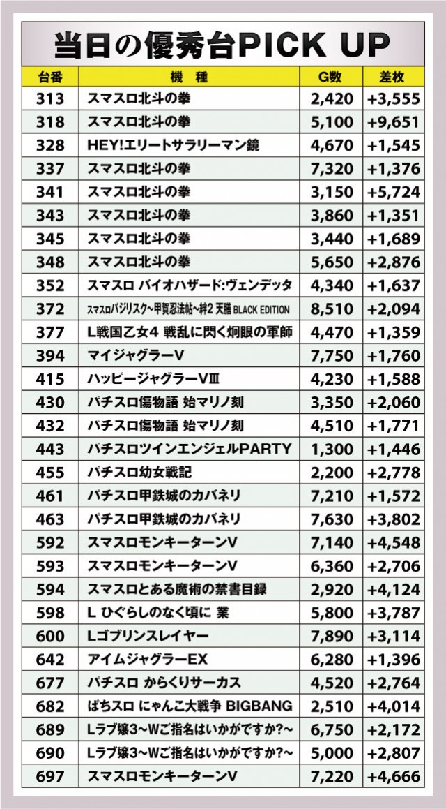 年末最後の「英雄」の優秀台はこちら。『スマスロ北斗の拳』を筆頭に注目機種となっている『スマスロモンキーターンⅤ』など…やはりココのグループ店舗はAT機が強い傾向にあるようだ。