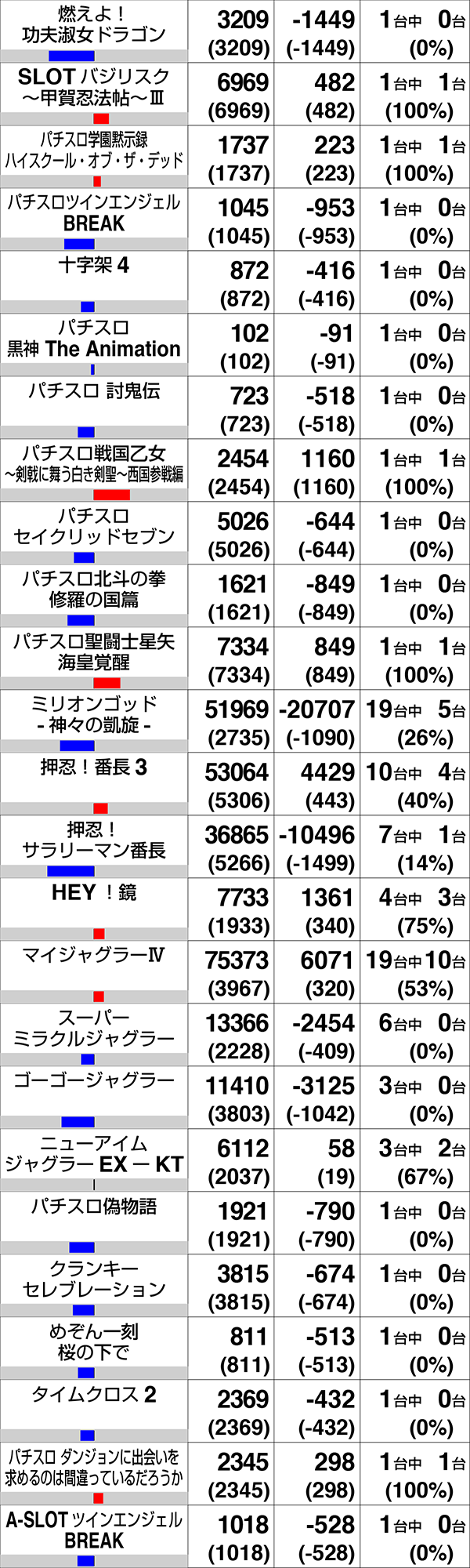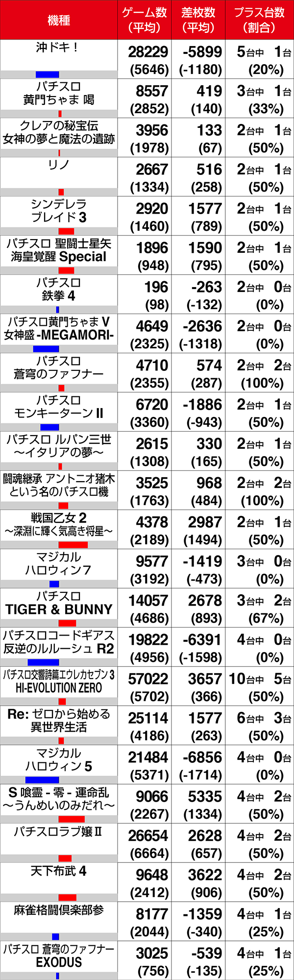 2台以上設置されている機種は45機種あり、そのうちの23機種がプラス差枚数を記録。全体で11台が3000ptを上回った。