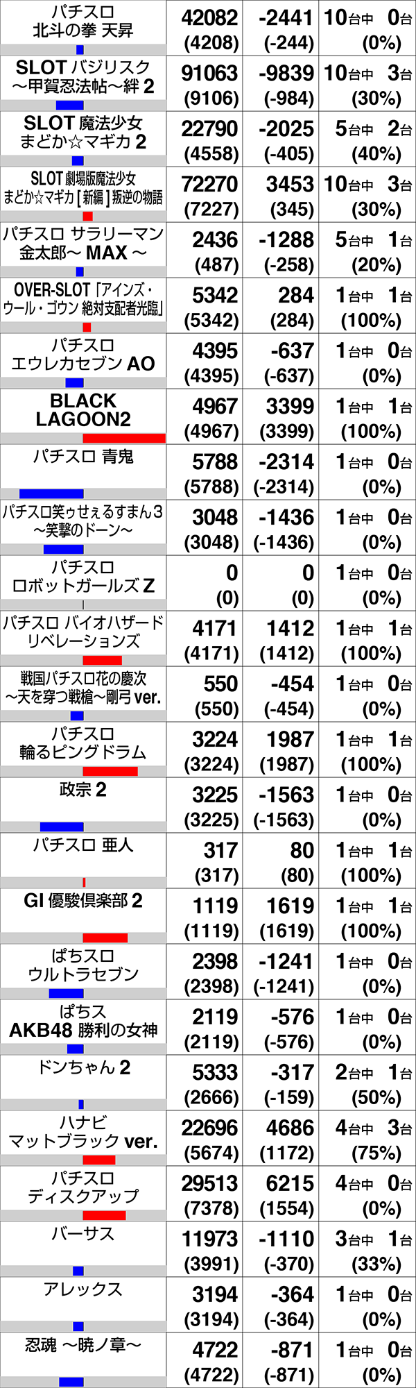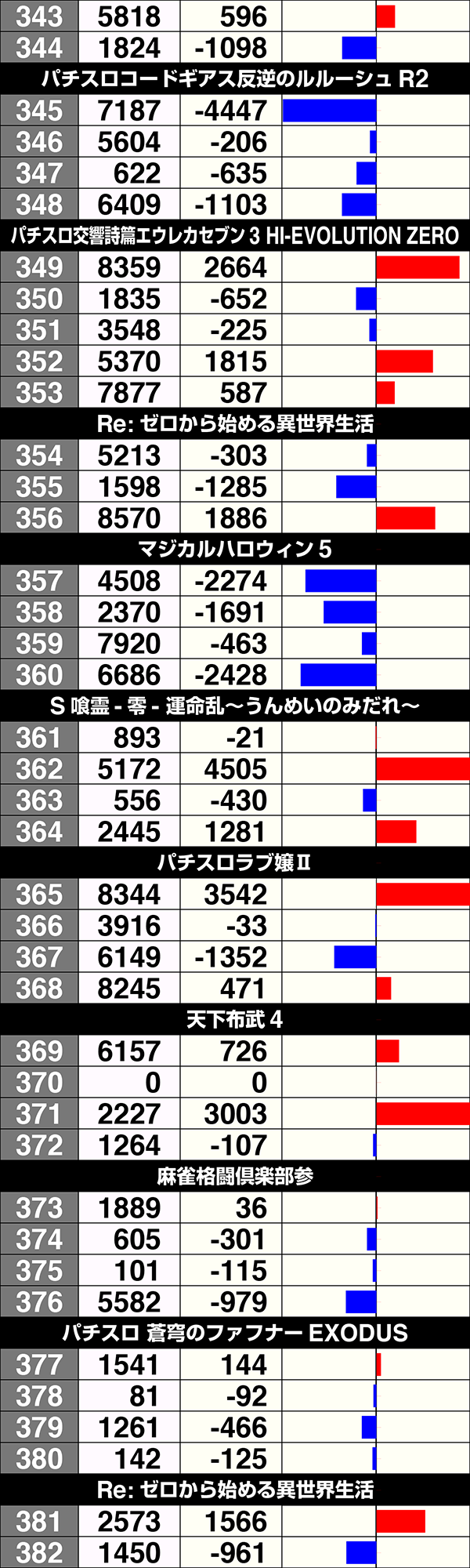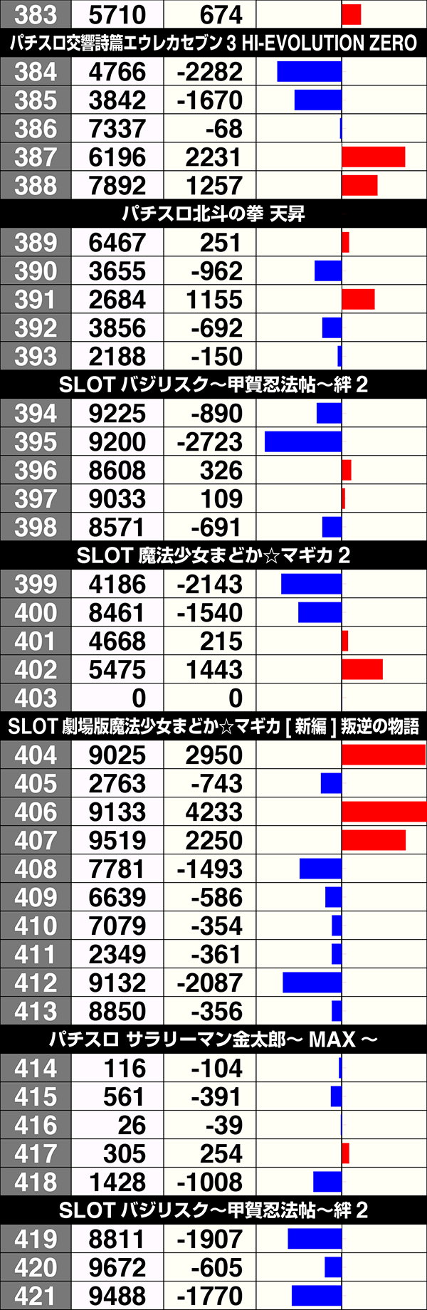 『SLOT劇場版魔法少女まどか☆マギカ[新編]叛逆の物語』はプラスである3台がいずれも2000ptオーバー。もっとも多かったのは、406番台の4233ptであった。