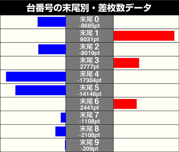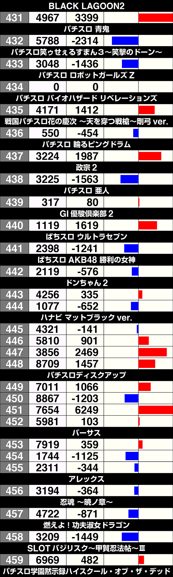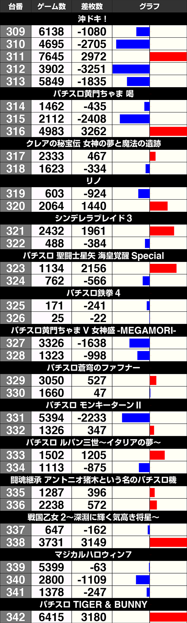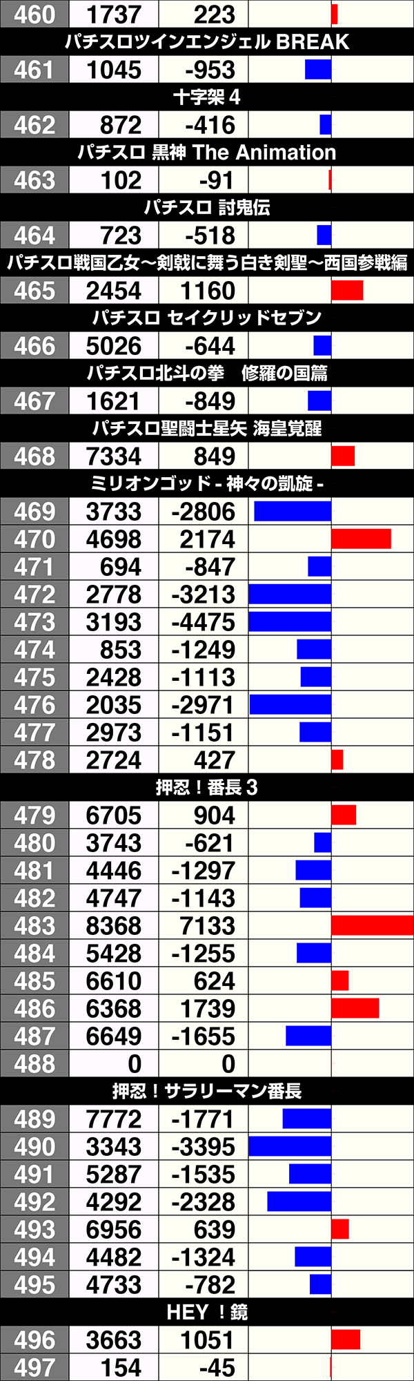 『SLOT劇場版魔法少女まどか☆マギカ[新編]叛逆の物語』はプラスである3台がいずれも2000ptオーバー。もっとも多かったのは、406番台の4233ptであった。