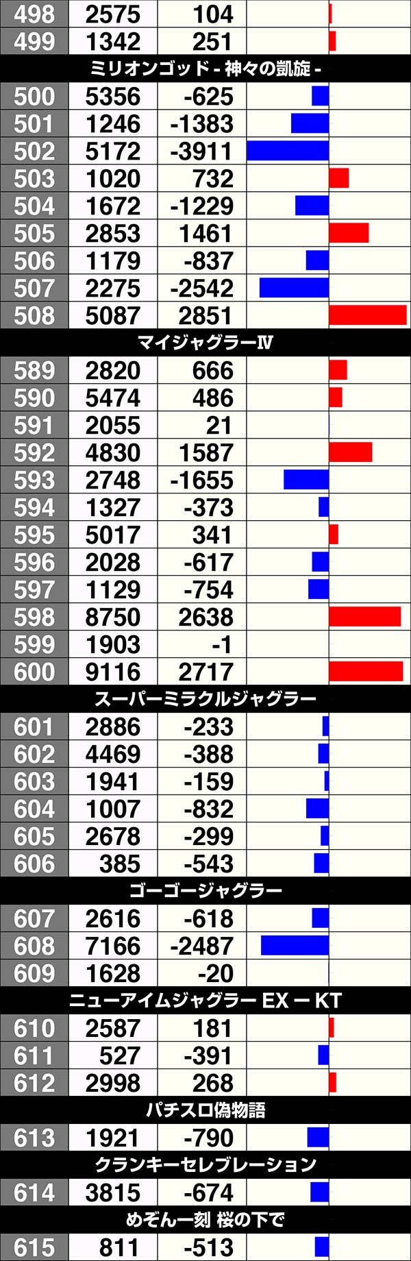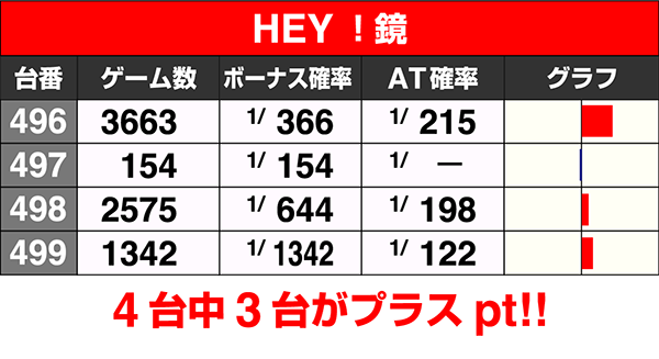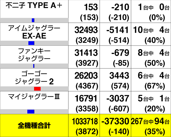 10台がプラスを記録した『マイジャグラーⅣ』以外のジャグラーシリーズでは、『ニューアイムジャグラーEXーKT』が3台中2台プラスであった。