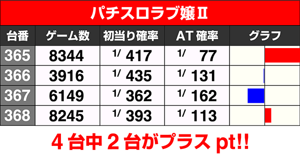 『パチスロラブ嬢Ⅱ』は4台中2台がプラスで、差枚数がプラスであった台はどちらもトータルゲーム数が8000Gを上回った。