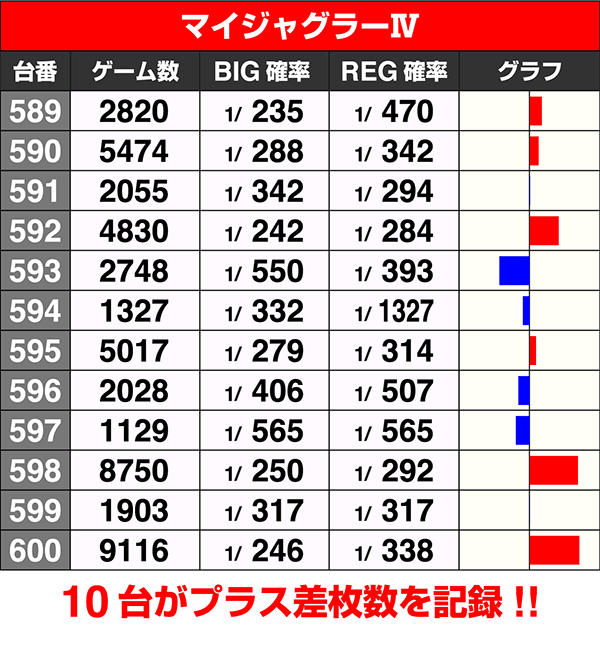 『マイジャグラーⅣ』は合計10台がプラスであり、2台のボーナス合算確率は1/140以上。