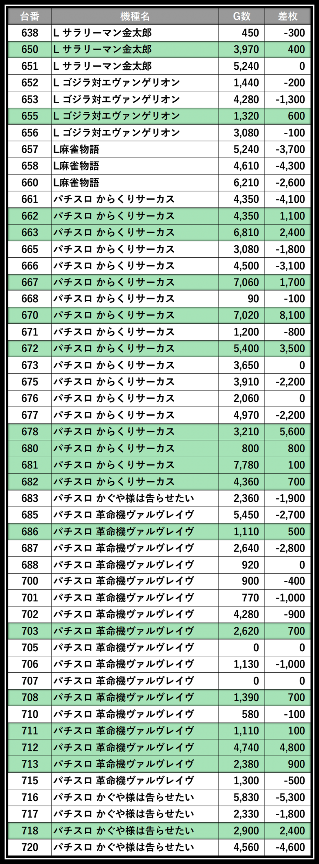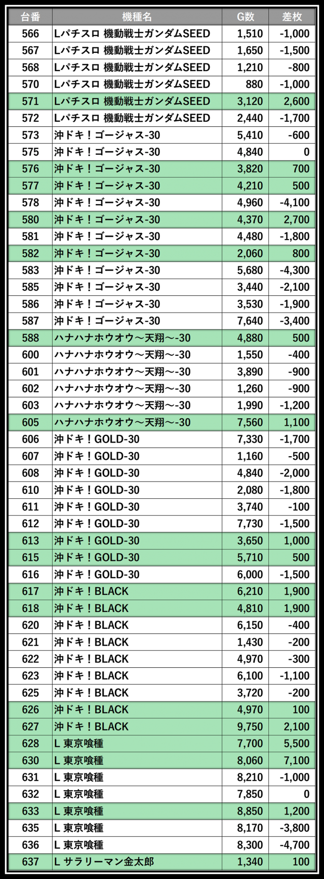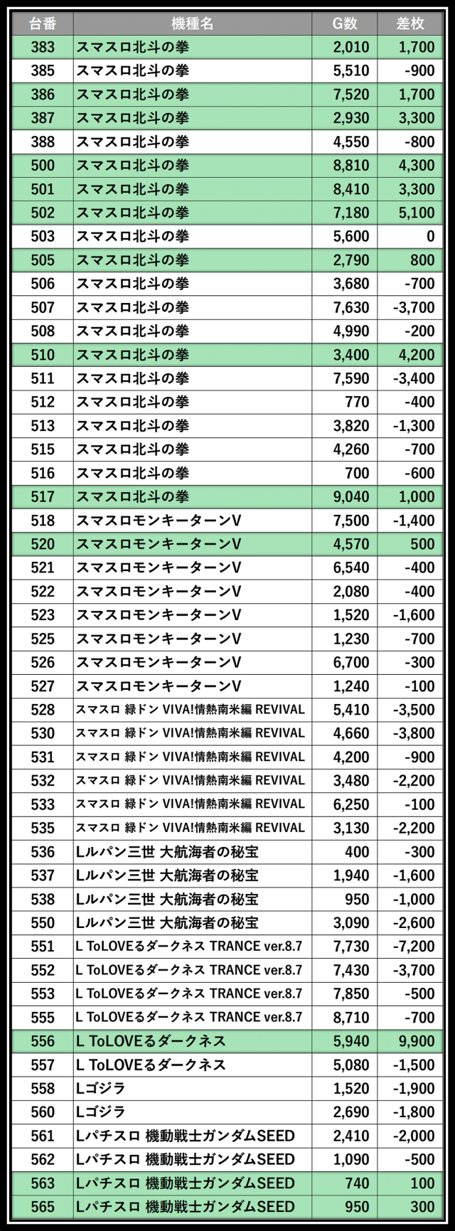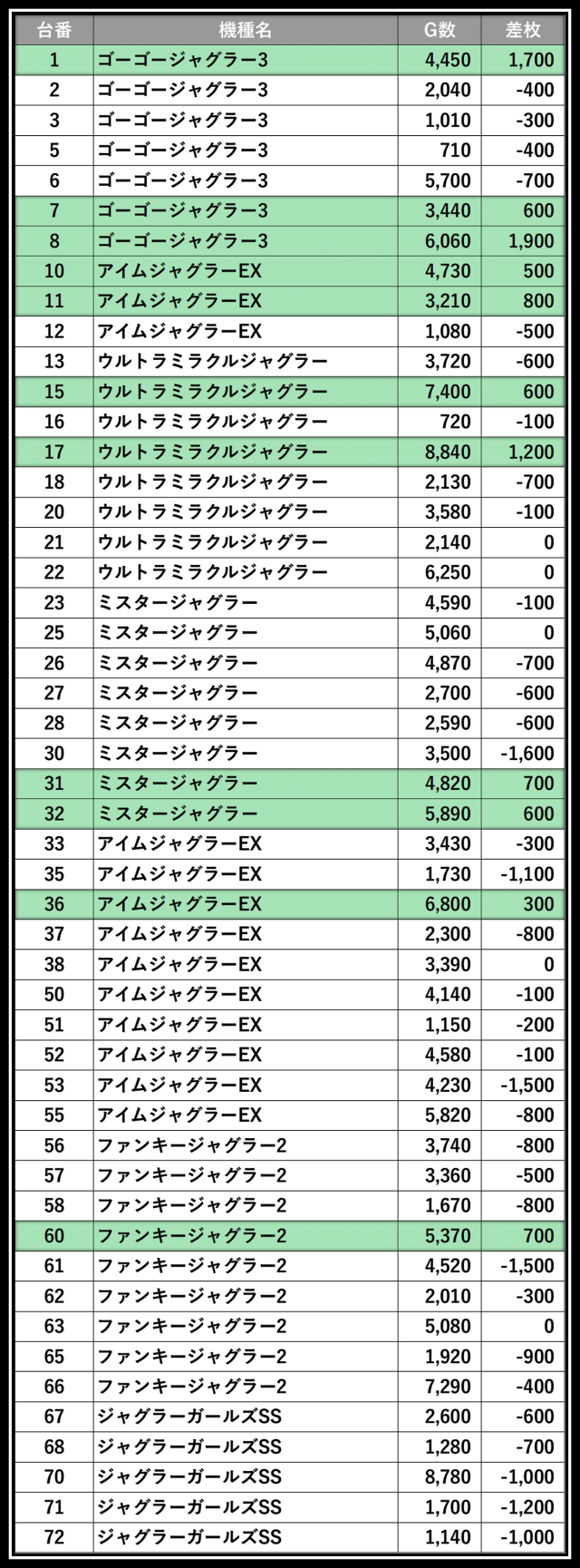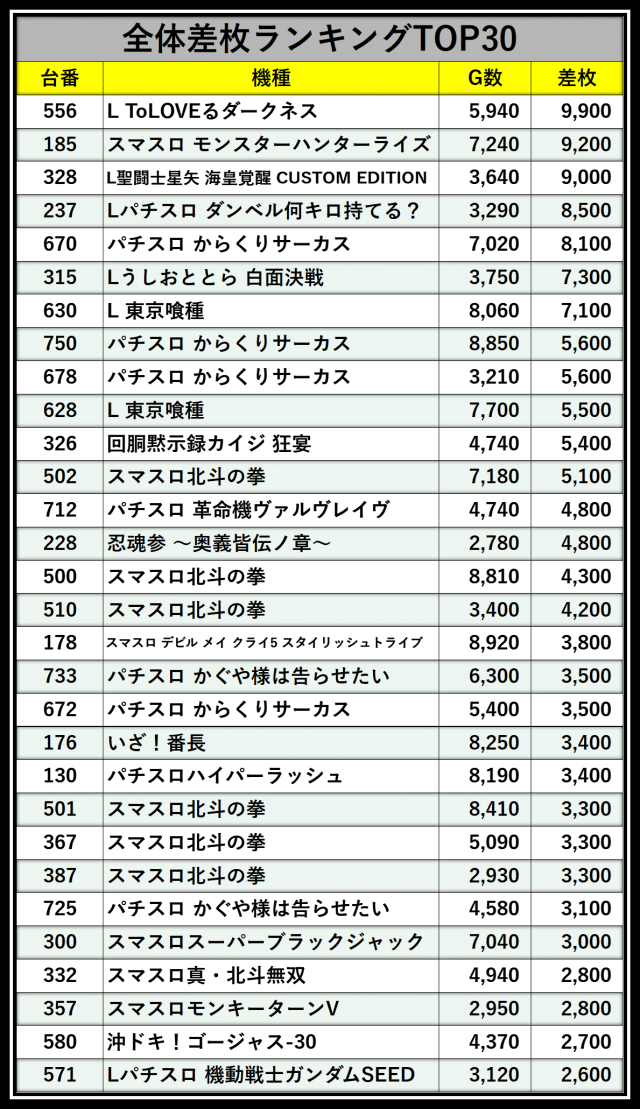 ※差枚数順に掲載しています