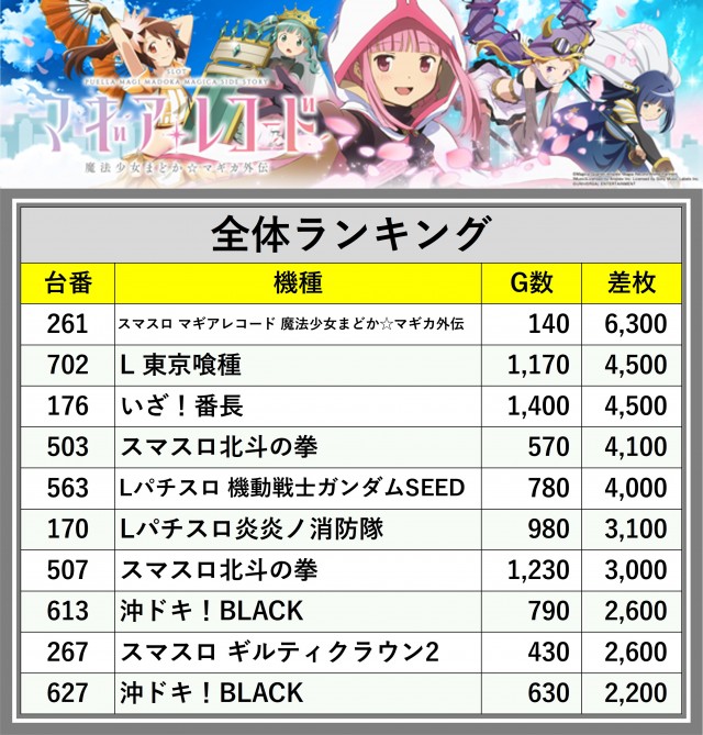 ※差枚数順に掲載しています