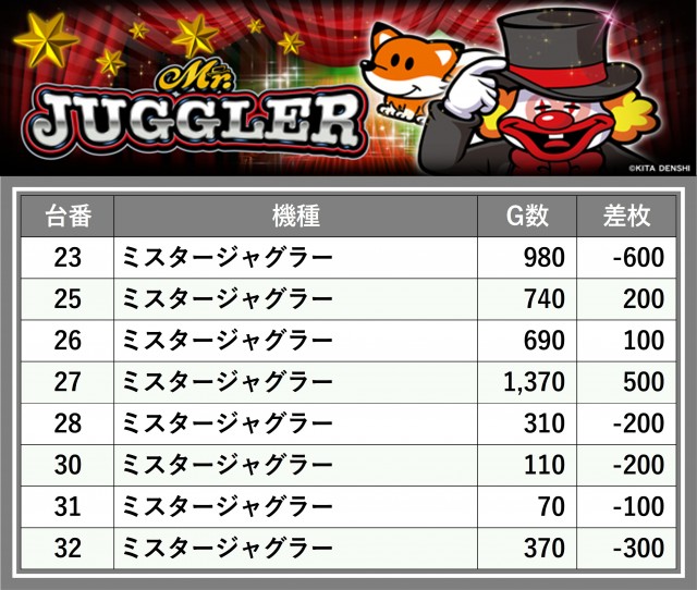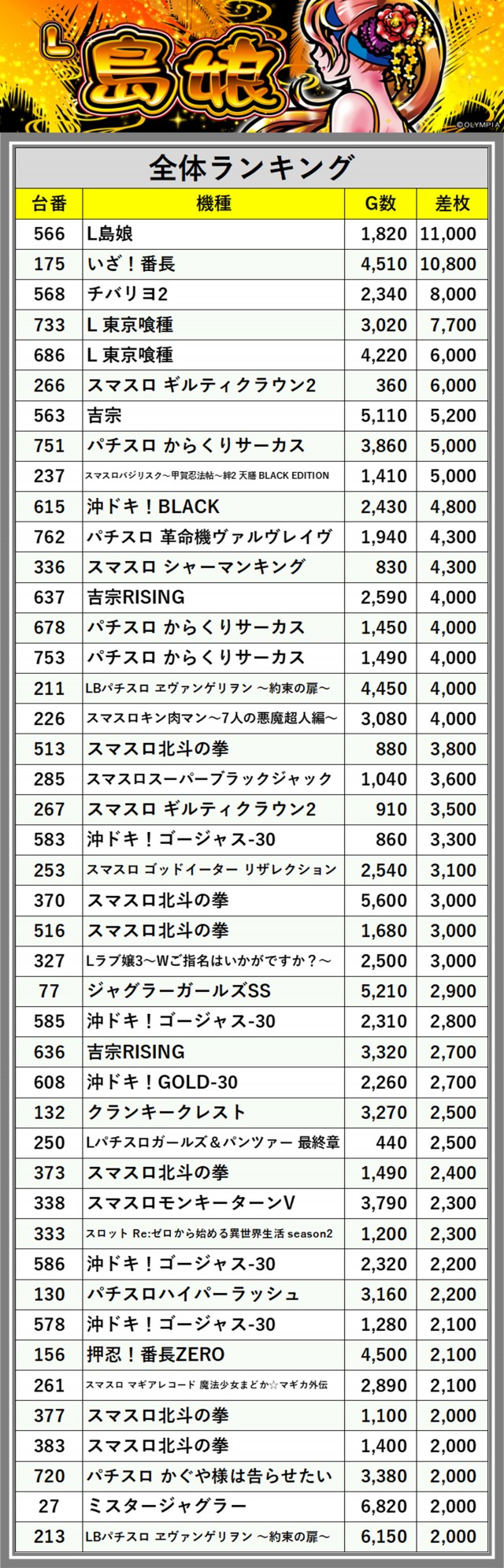 厳選された取材対象機種をはじめ、その他スロット全体から好記録が飛び出した!プレイヤーが楽しんだ1日を下記データにて振り返ってみて欲しい。