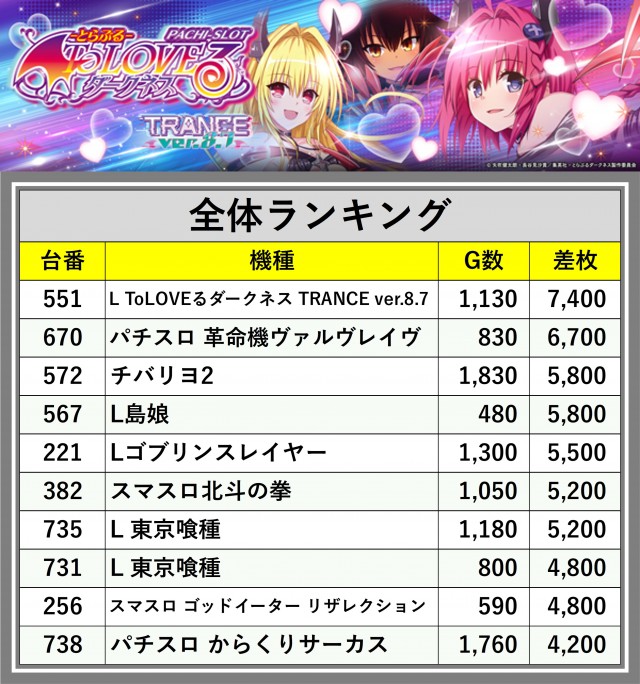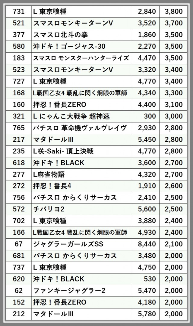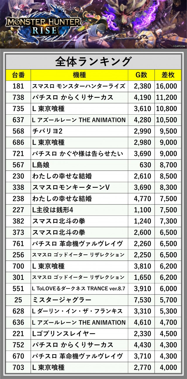 厳選された取材対象機種をはじめ、その他スロット全体から好記録が飛び出した!プレイヤーが楽しんだ1日を下記データにて振り返ってみて欲しい。