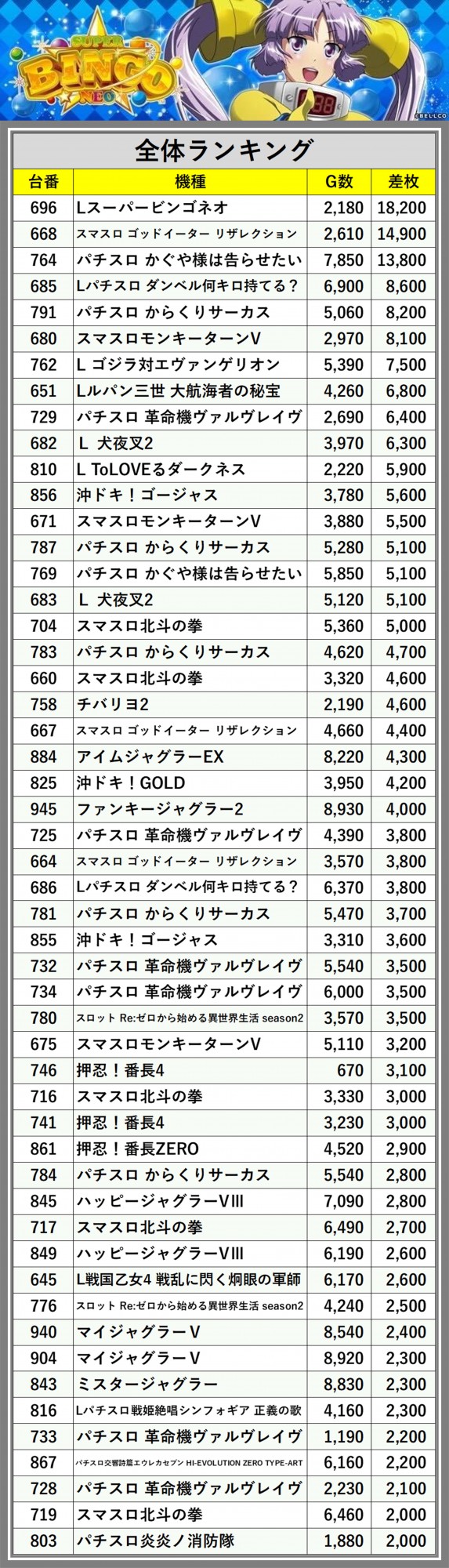 厳選された取材対象機種をはじめ、その他スロット全体から好記録が飛び出した!プレイヤーが楽しんだ1日を下記データにて振り返ってみて欲しい。