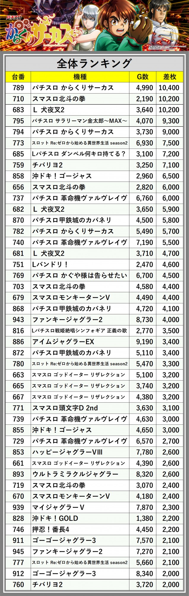 厳選された取材対象機種をはじめ、その他スロット全体から好記録が飛び出した!プレイヤーが楽しんだ1日を下記データにて振り返ってみて欲しい。