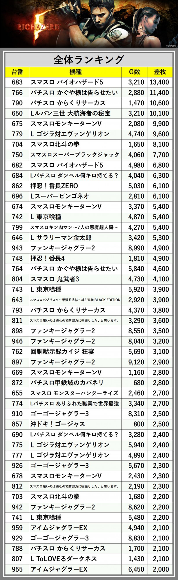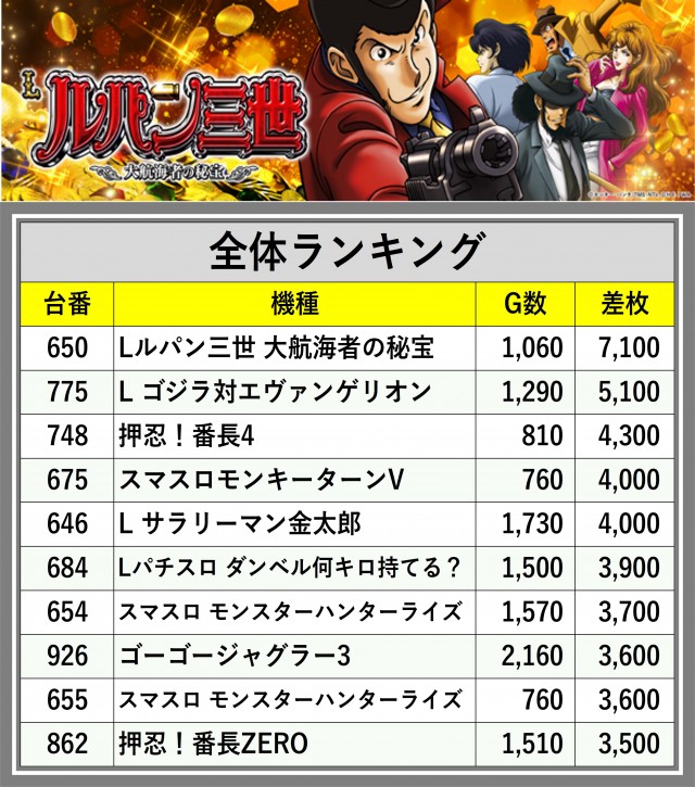 ※差枚数順に掲載しています