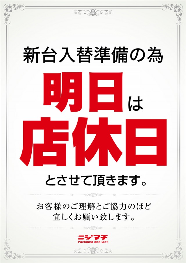 明日は新台入替準備の為「店休日」とさせて頂きます☆彡