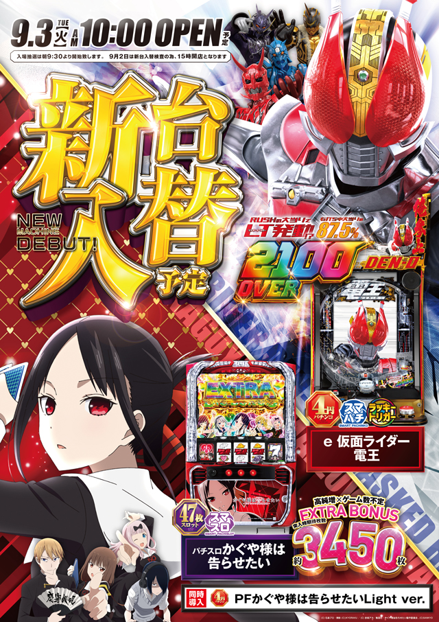 明日9月18日(水)「新台入替」朝10時開店「人気機種」導入