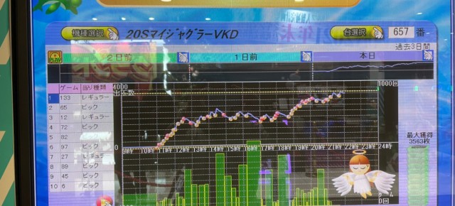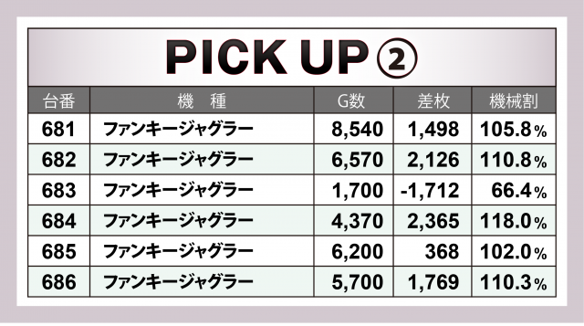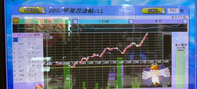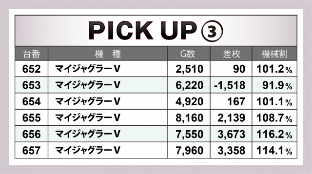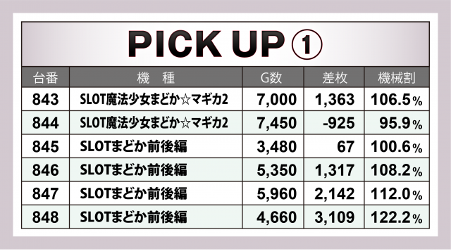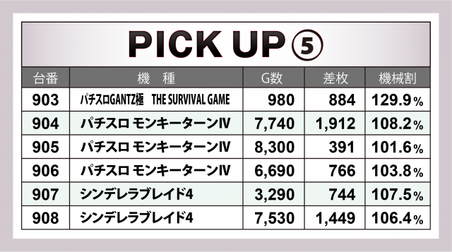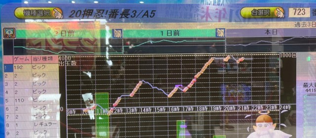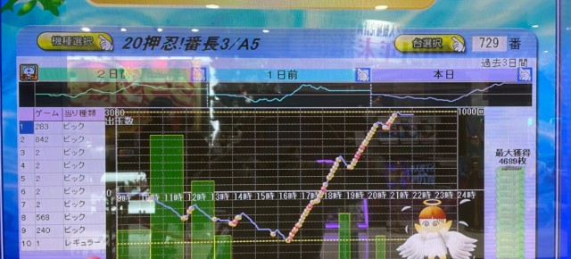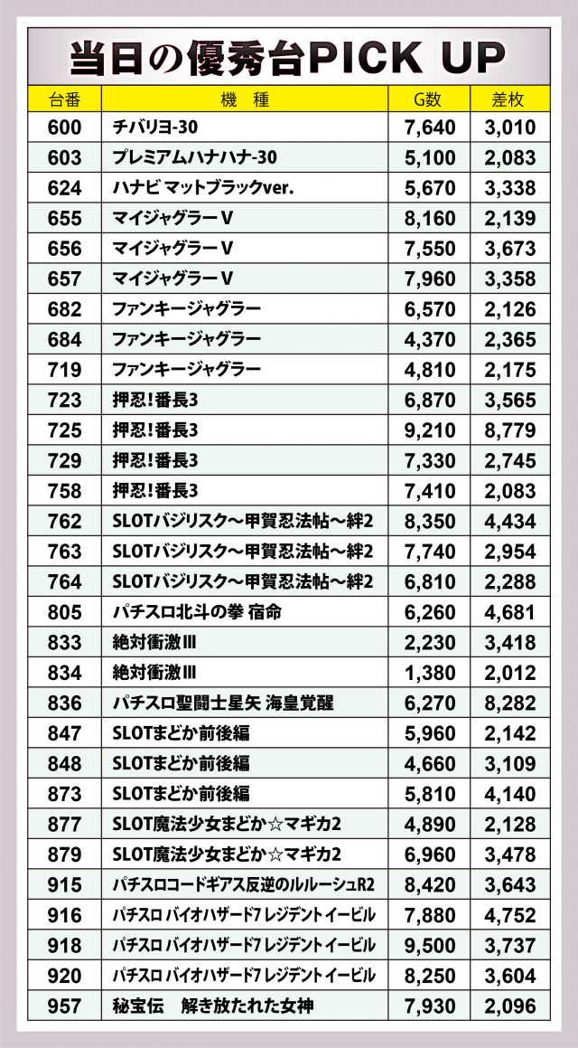 では当日の[1,000円/46枚] スロの模様を振り返っていこう。まずは優秀30台のピックアップ。後述する横並び好況スポット以外では、『押忍!番長3』『SLOTバジリスク~甲賀忍法帖~絆2』『パチスロ聖闘士星矢 海皇覚醒』3機種の好調が目立った。特に『番長3』は4台で差枚数+1万7千枚超え!