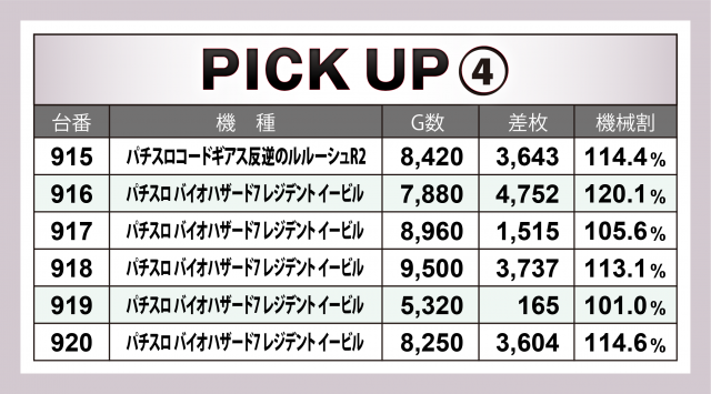 さらにこの日は横並び好況スポットが5か所出現。中でも多く目立ったのが『パチスロ バイオハザード7 レジデント イービル』。5台全てがプラス台&その差枚数は+1万3千枚を突破!