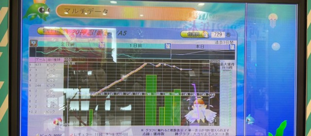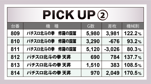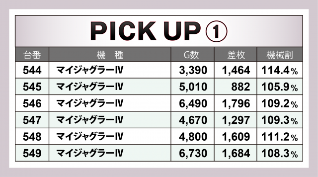 また当日は『マイジャグラーⅣ』とパチスロ北斗の拳シリーズが横並び好況スポットとなった。前者は6台全てプラスでトータル+8千枚超、後者は荒れ模様となったが+4千枚弱を刻んだ台も。