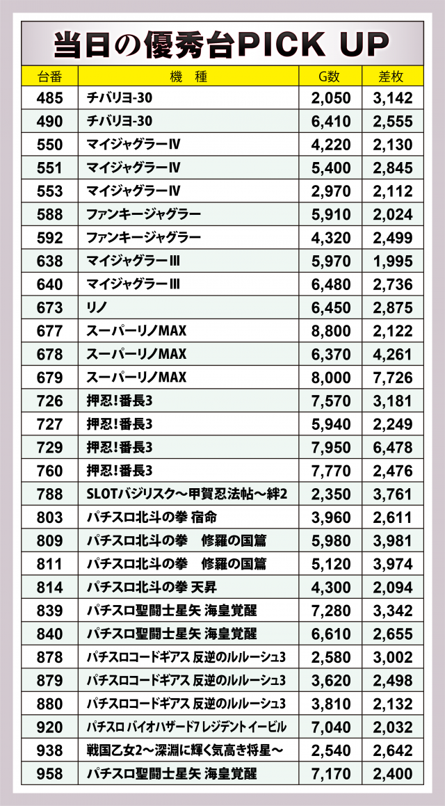 ではまず当日の優秀30台PICK UPから。差枚数でハイスコアとなったのはまず『押忍!番長3』で、プラスの3台トータル+1万1千枚を記録。また、ジャグラーシリーズ・リノシリーズを中心としたボーナスタイプが各台差枚数+2千枚超の台が多く好調が目立った。