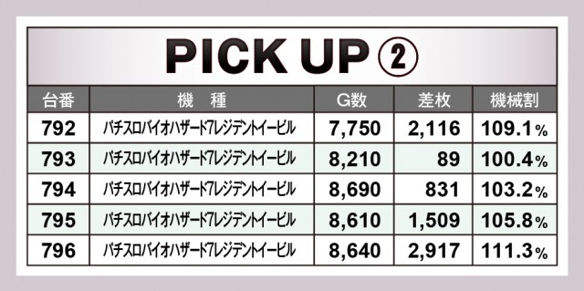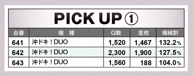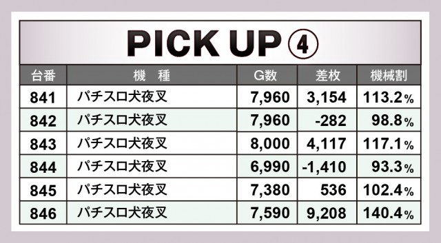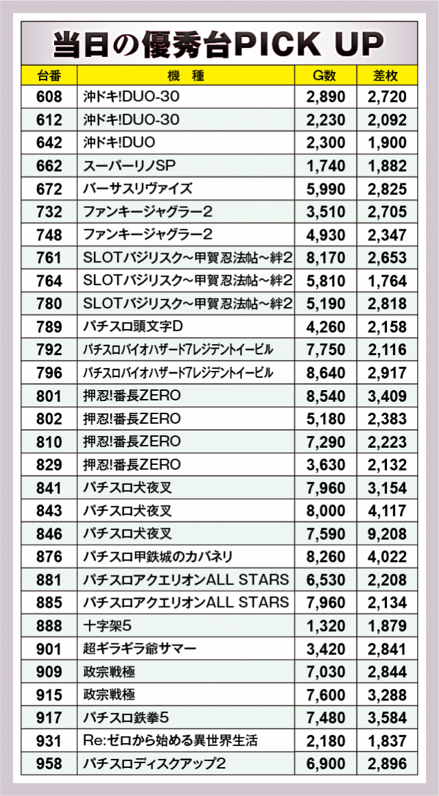 また、この日は4機種計17台の横並び好況スポットが出現。中でも優秀だったのが『パチスロ犬夜叉』で、この日のトップ成績を叩き出した846番台が差枚数+9,208枚獲得するなど6.5号機の爆発力を見せつけた。また『沖ドキ!DUO』で3台トータル+3千枚オーバー、『押忍!番長ZERO』で3台トータル+4千枚オーバー、『パチスロバイオハザード7レジデントイービル』で5台トータル+7千枚オーバーという成績だった。