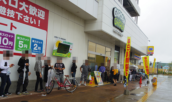 朝イチはパチンコとパチスロで別々に入場抽選がおこなわれており、両方を合わせて30名前後のプレイヤーが参加していた。