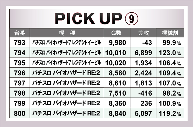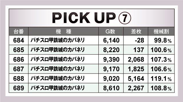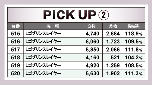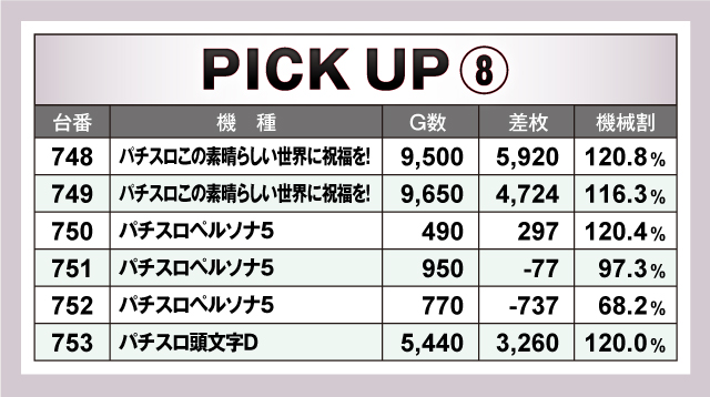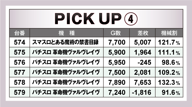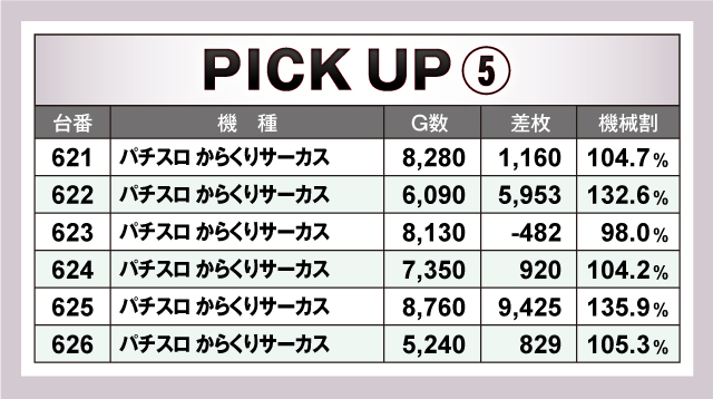 続いては、当日ならびで活躍していた10箇所を紹介。すべての並びが平均+1,000枚を超える好調ぶりで、そのうち平均+2,000枚オーバーの並びは6箇所出現! なかでも621番台〜626番台の「パチスロ からくりサーカス」は、5/6台がプラスで平均+3,395枚と圧倒的! 荒い機種ながらもしっかりと結果を残していた!