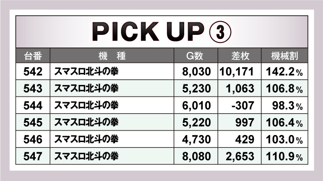 まずは優秀台30台の紹介から。30台すべてが+2,000枚オーバーで、+3,000枚オーバーは25台。そして+5,000枚オーバーは10台と、多種多様な機種から好記録が出現! そのなかでもっとも優秀だったのは、542番台の「スマスロ北斗の拳」で、差枚+10,171枚を獲得! 全体を見渡してみるとスマスロの活躍が圧倒的で、特定機種だけでなく幅広い機種にチャンスが散りばめられていた可能性が高そうだ!