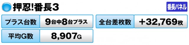9台中8台がプラスで全台差枚数は+32,769枚、平均G数も8,907Gと、いずれも優秀な数値を記録。