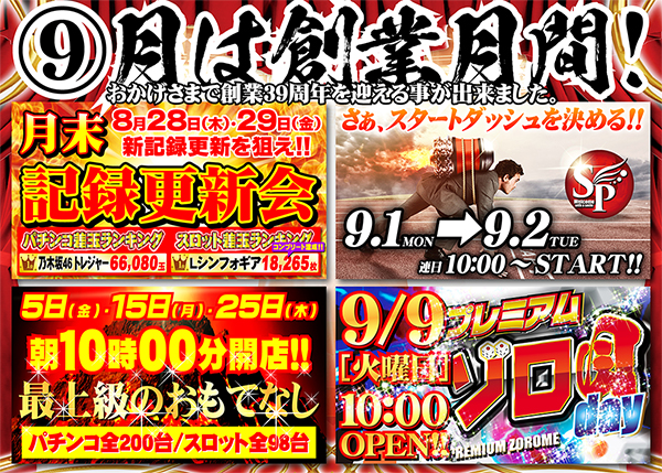明日10時開店!【創業39周年~⑨月度の新台入替初日!~】