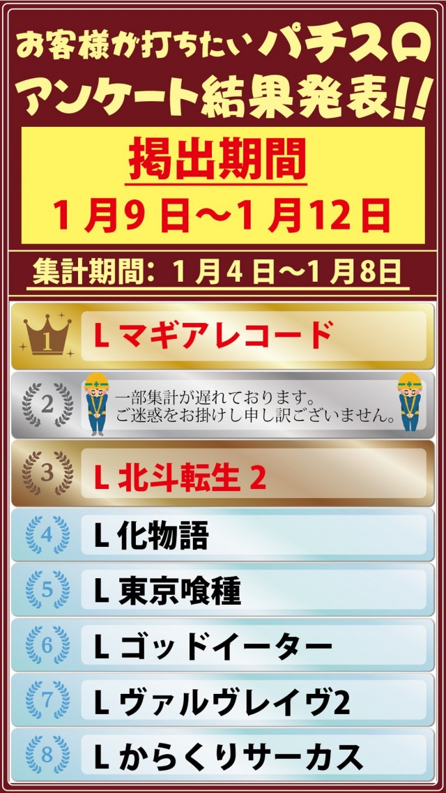 1位 1月4日(日) 2位 1月11日(日) 3位 12月18日(木)