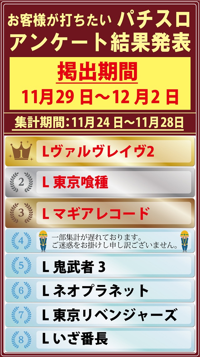 1位 11月22日(土) 2位 11月15日(土) 3位 11月7日(金)