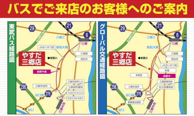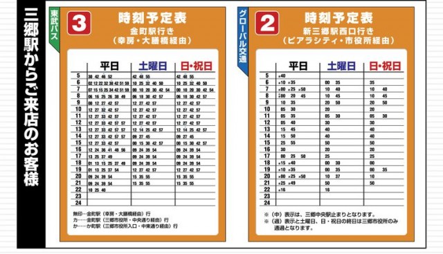 三郷駅より歩いて15分、東武バス三郷市役所行き岩野木境停留所前または飯島興業バス新三郷駅行き・岩野木停留所にて目の前!つくばエクスプレス三郷中央駅より徒歩10分・マイスカイ交通バス三郷駅北口行き岩野木停留所にて目の前です!! マップコードはコチラ≪ 6 870 713*84 ≫ |