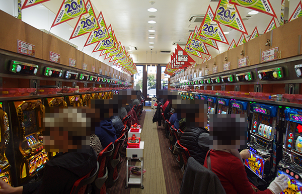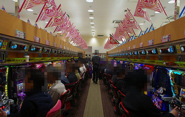 開店直後はパチスロに向かうプレイヤーが多く、なかでも2円パチスロは設置している40台すべてが埋まるほど盛況となっていた。