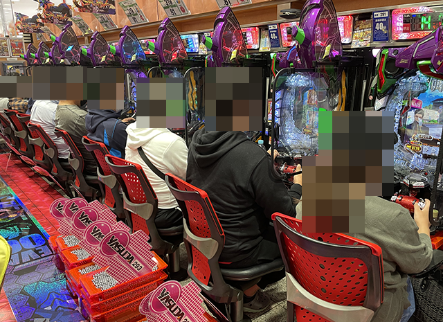 夕方頃にはたくさんのプレイヤーが来店し、パチンコとパチスロの両方が大きなにぎわいに包まれていた。