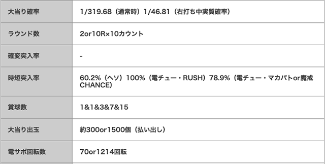 初当りの60.2%で突入する「RUSH」は、69回転で約1/47を引ければ大当り+RUSH継続となるST風のゲーム性。時短のラスト1回転or残り保留消化で引き戻した場合は、ラウンド中のバトル勝利で継続を決めるループタイプの「魔戒CHANCE」へ突入する。