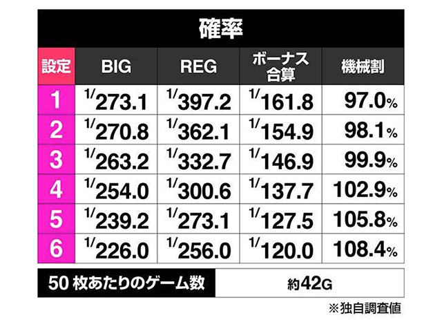ボーナス確率を軸に設定推測を進めよう。設定差が大きいREG確率はとくに注目。
