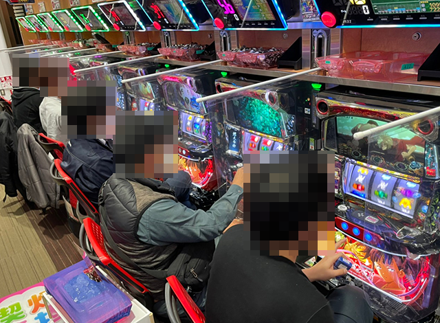 「パチスロ甲鉄城のカバネリ」にて、プレイヤーたちは機種の魅力を堪能していた模様。席を立つ気配は感じられなかった。