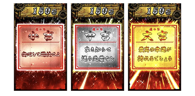 通常時のサブ液晶に出現するおみくじは、色で設定を示唆。銀ならば設定4以上、金ならば設定6が濃厚だ。