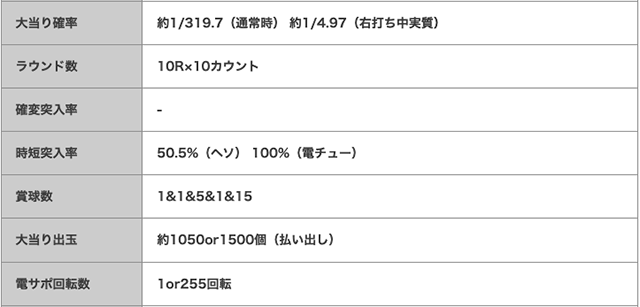 スペックは1種2種混合タイプで、時短が1回転と255回転(残り保留は最大4個)の2種類がある。